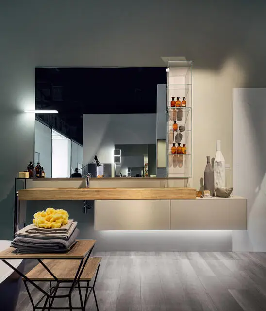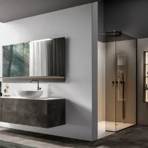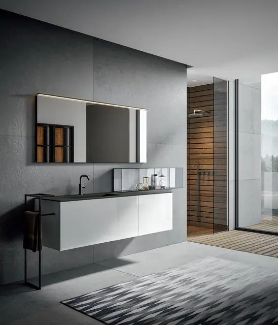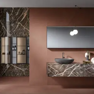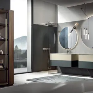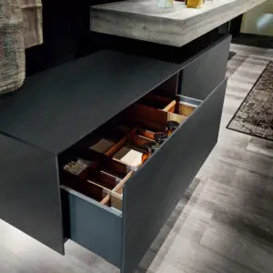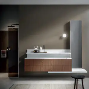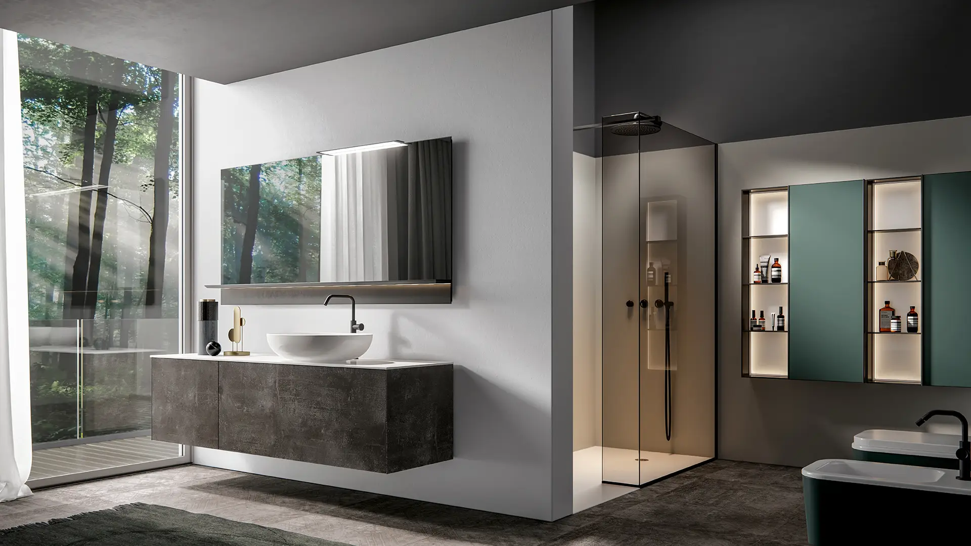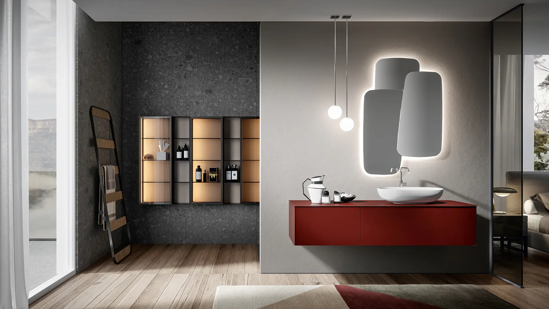 The minimalist character of Enea is realized in the use of sides and tops with reduced thickness and for the opening through a push-pull system that allows to maintain the continuity of the fronts. The apparent simplicity of this collection is enriched by the use of quality materials such as glass, Laminam porcelain stoneware or Warm By KeraKoll resins, which completely cover the furniture, creating interesting contrasts.