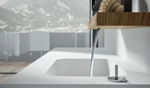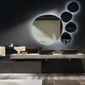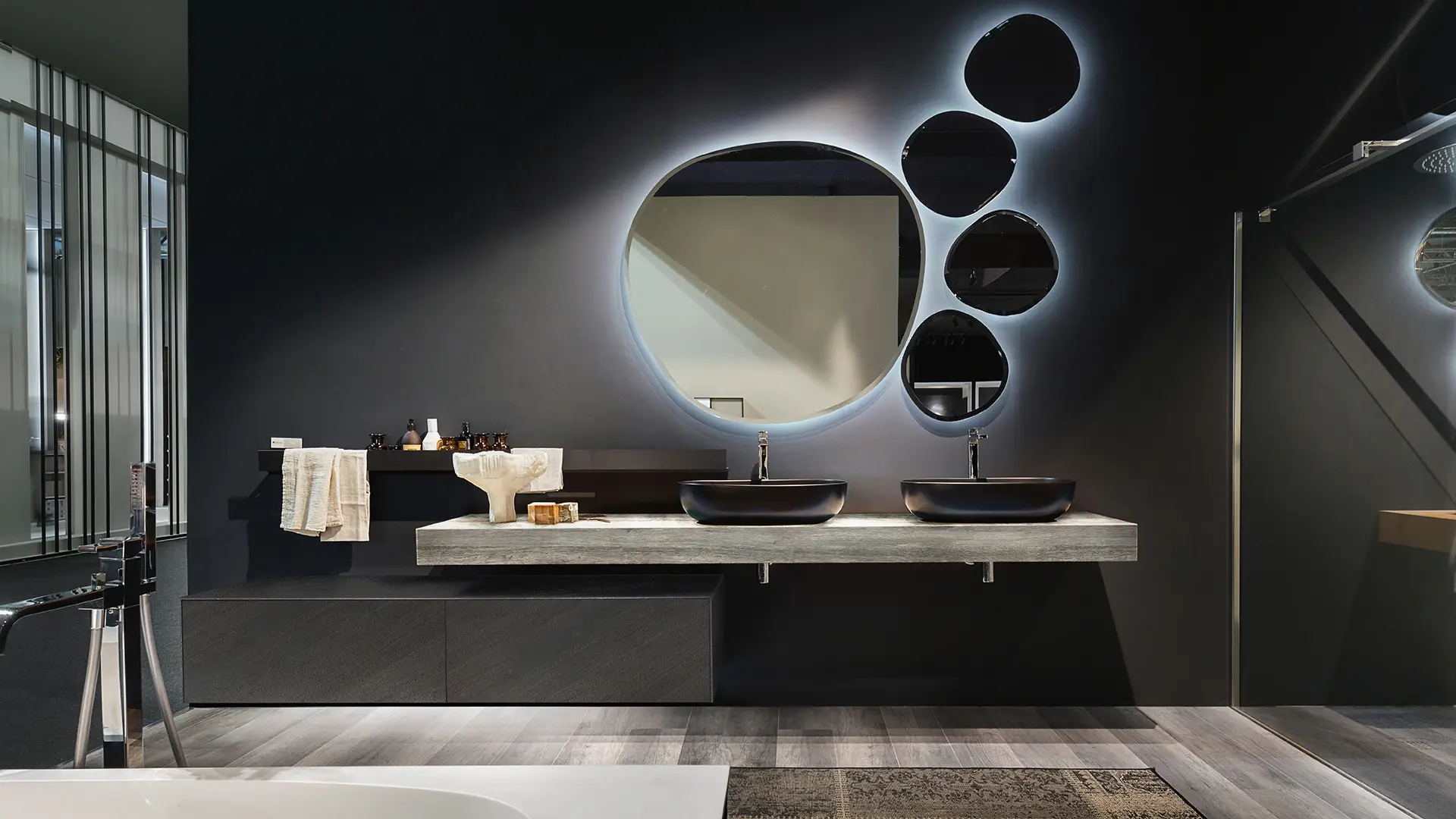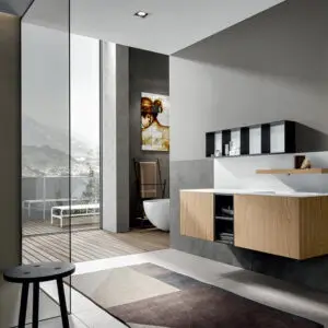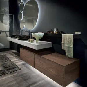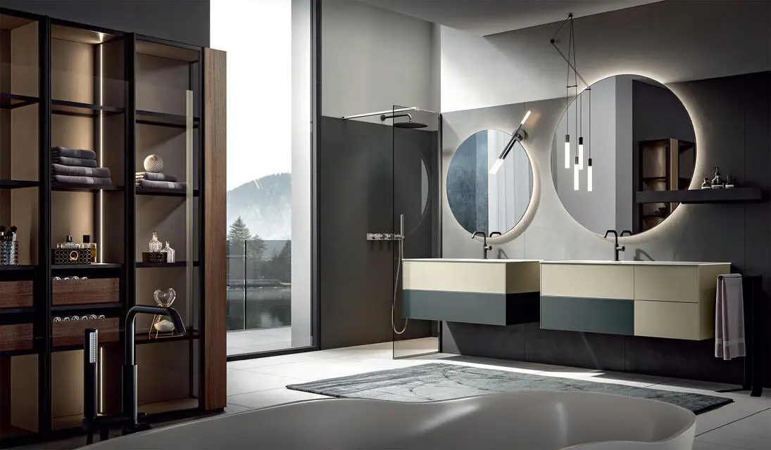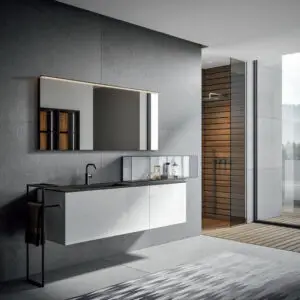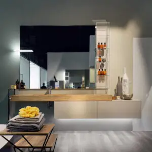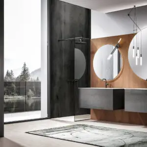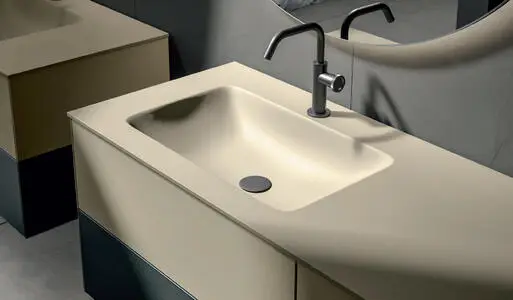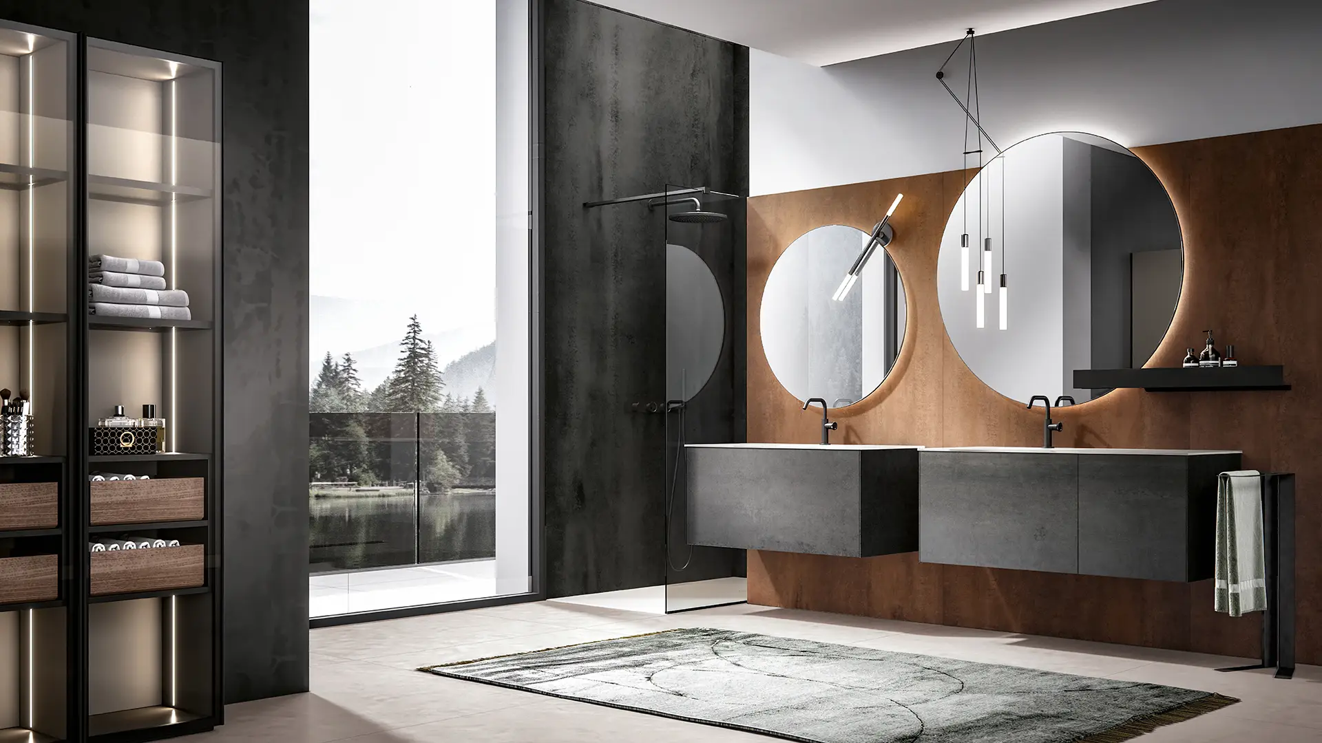 The minimalist character of Enea is realized in the use of sides and tops with reduced thickness and for the opening through a push-pull system that allows to maintain the continuity of the fronts. The apparent simplicity of this collection is enriched by the use of quality materials such as glass, Laminam porcelain stoneware or Warm By KeraKoll resins, which completely cover the furniture, creating interesting contrasts.