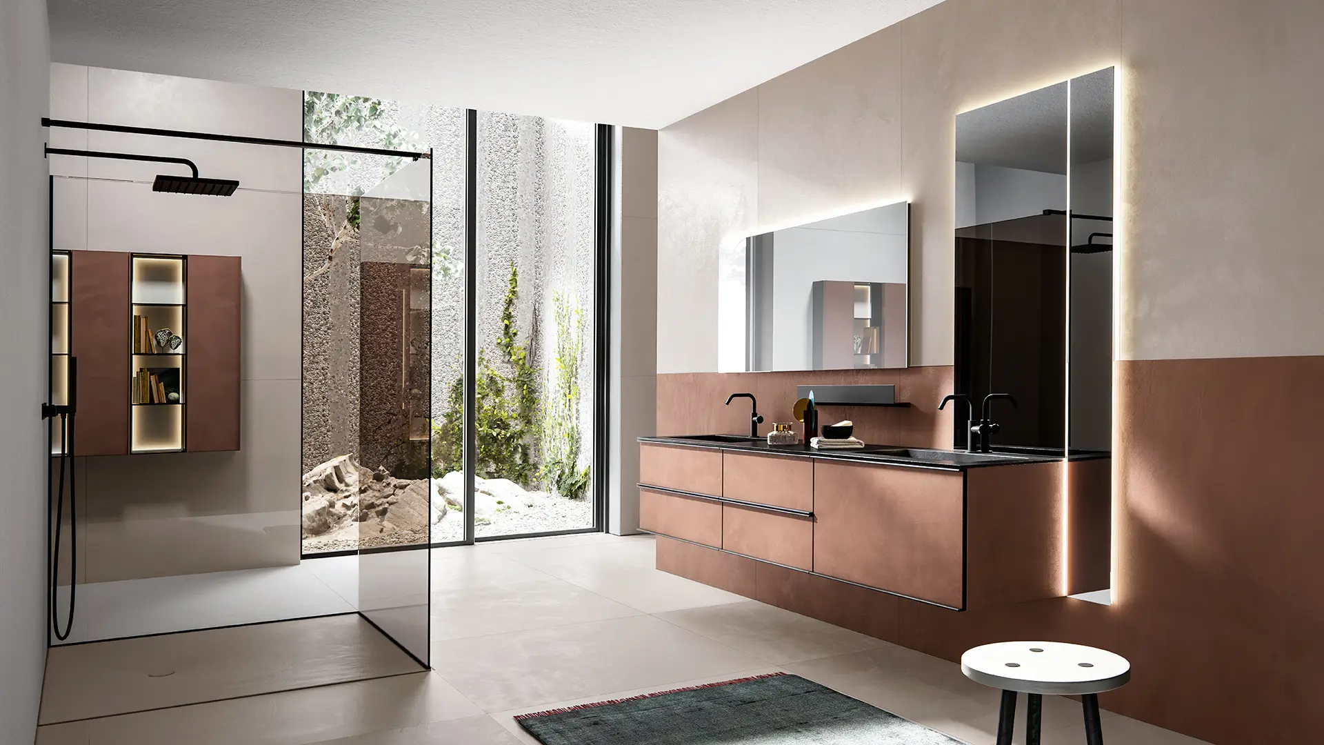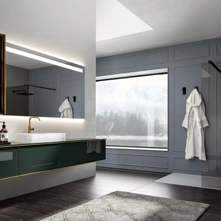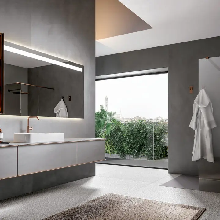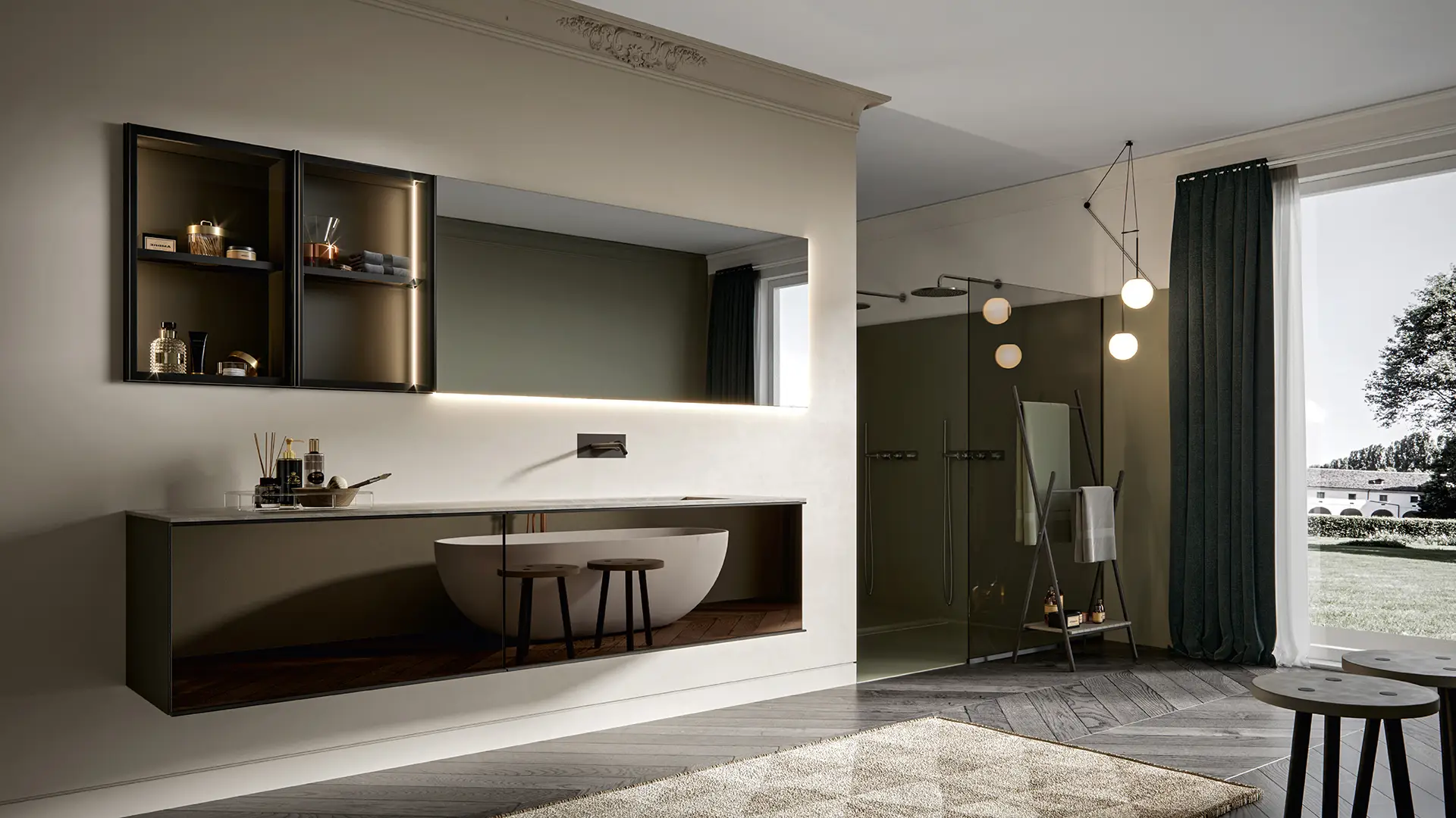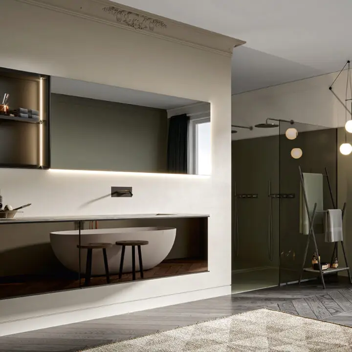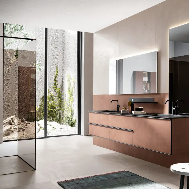 DOORS AND DRAWER FRONTS: made of panels in MDF, Glass, Fume Mirror, Veneer, Warm by Kerakoll and Laminam inserted into an aluminium frame. The aluminium frame is available in 5 finishes (Panna, Asfalto, Gold, Rosato and Champagne).