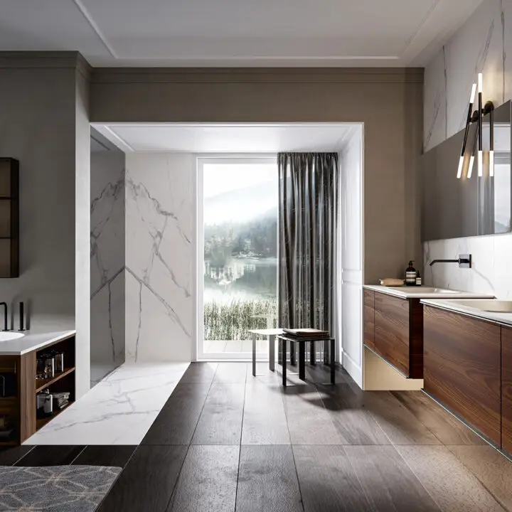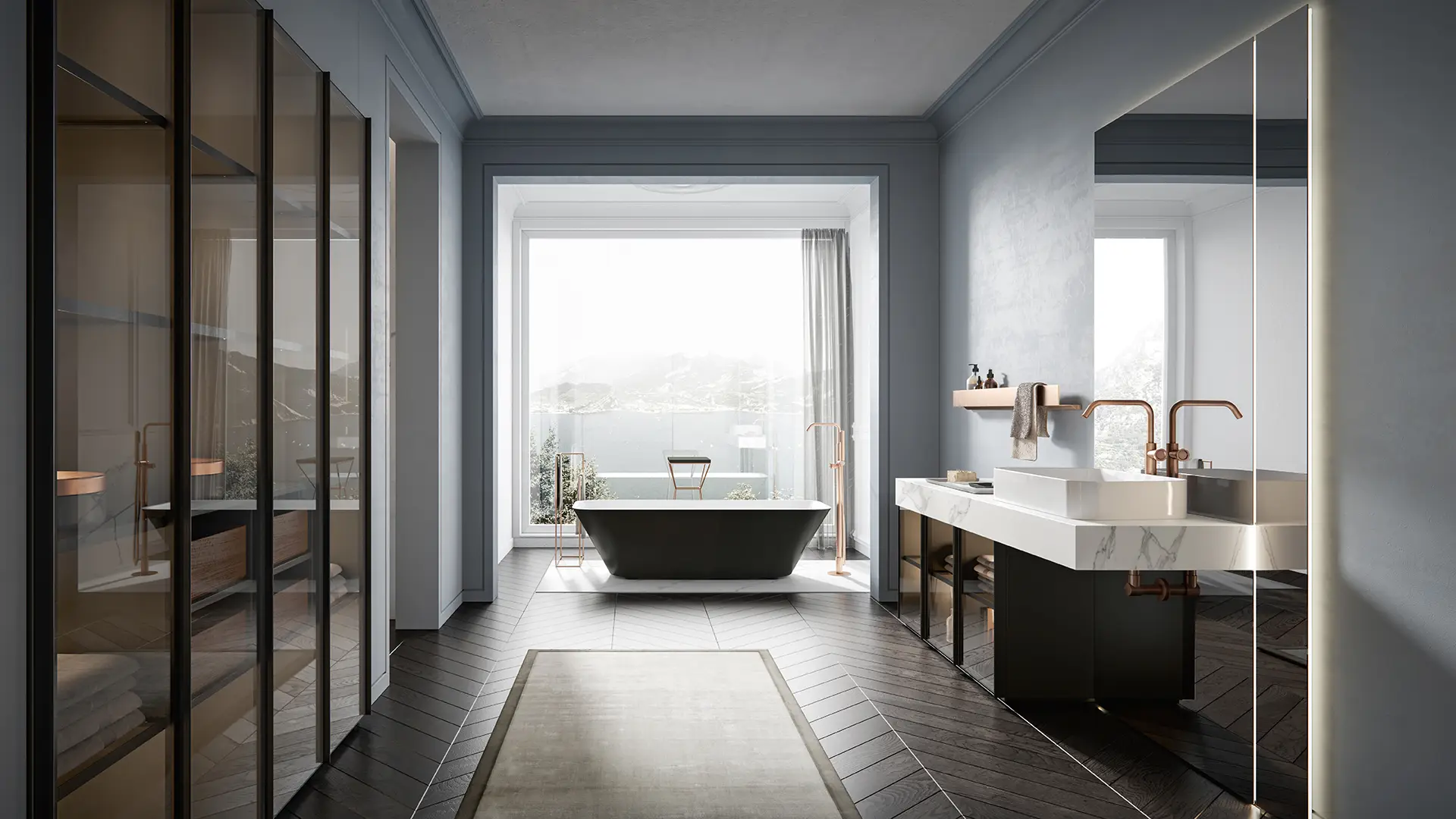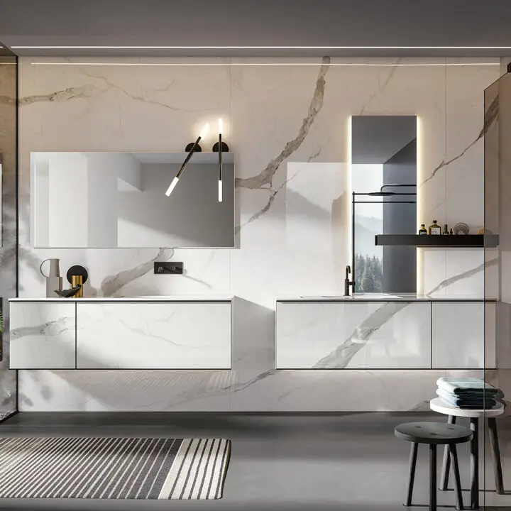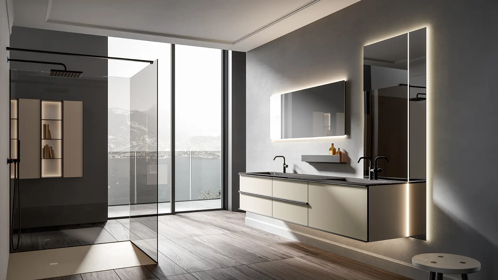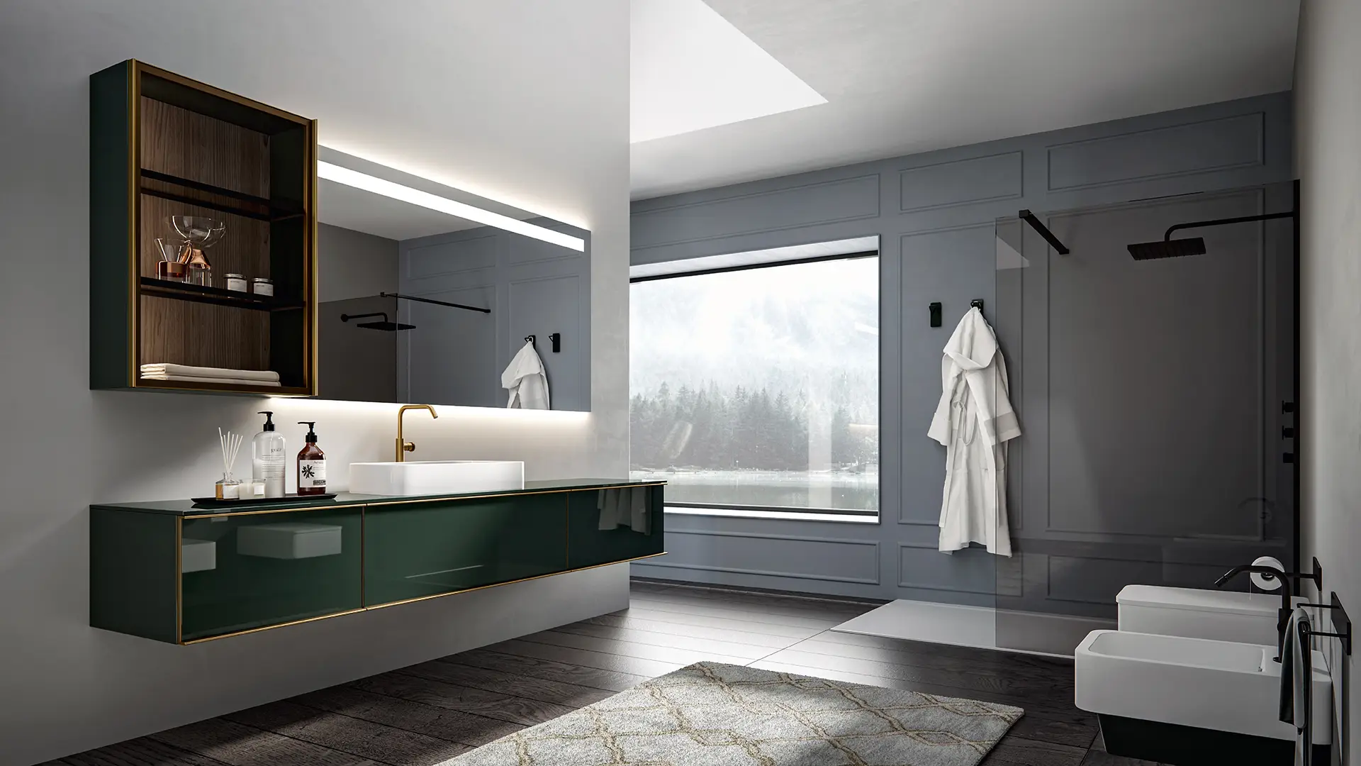 DOORS AND DRAWER FRONTS: made of panels in MDF, Glass, Fume Mirror, Veneer, Warm by Kerakoll and Laminam inserted into an aluminium frame. The aluminium frame is available in 5 finishes (Panna, Asfalto, Gold, Rosato and Champagne).