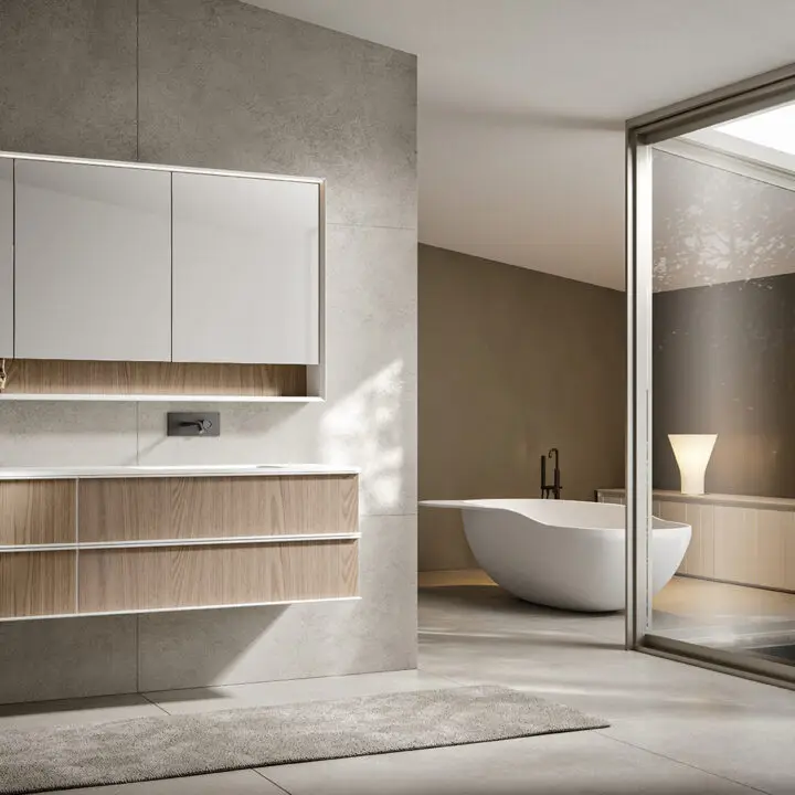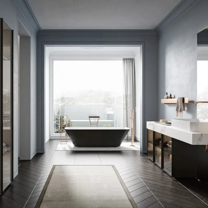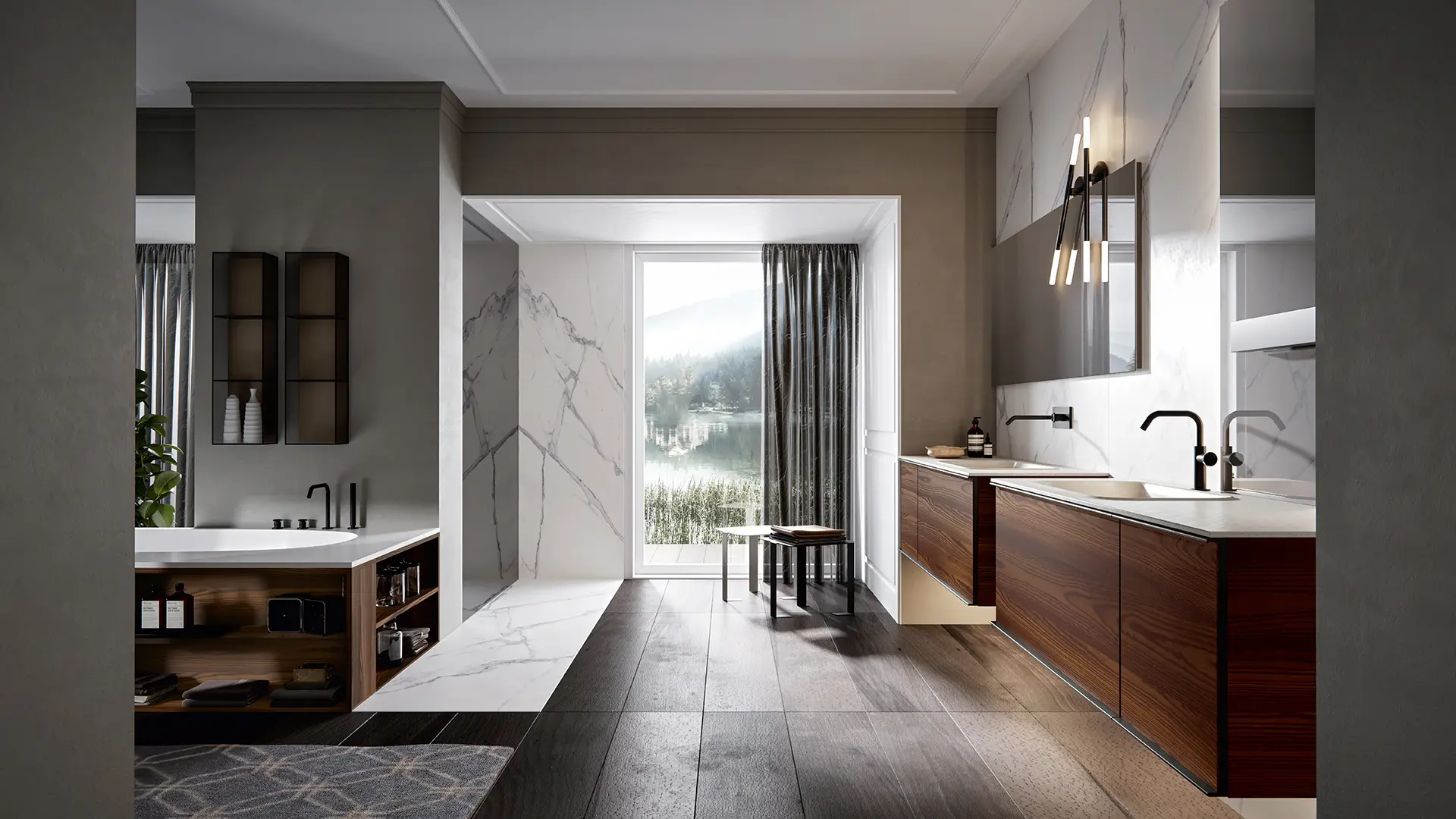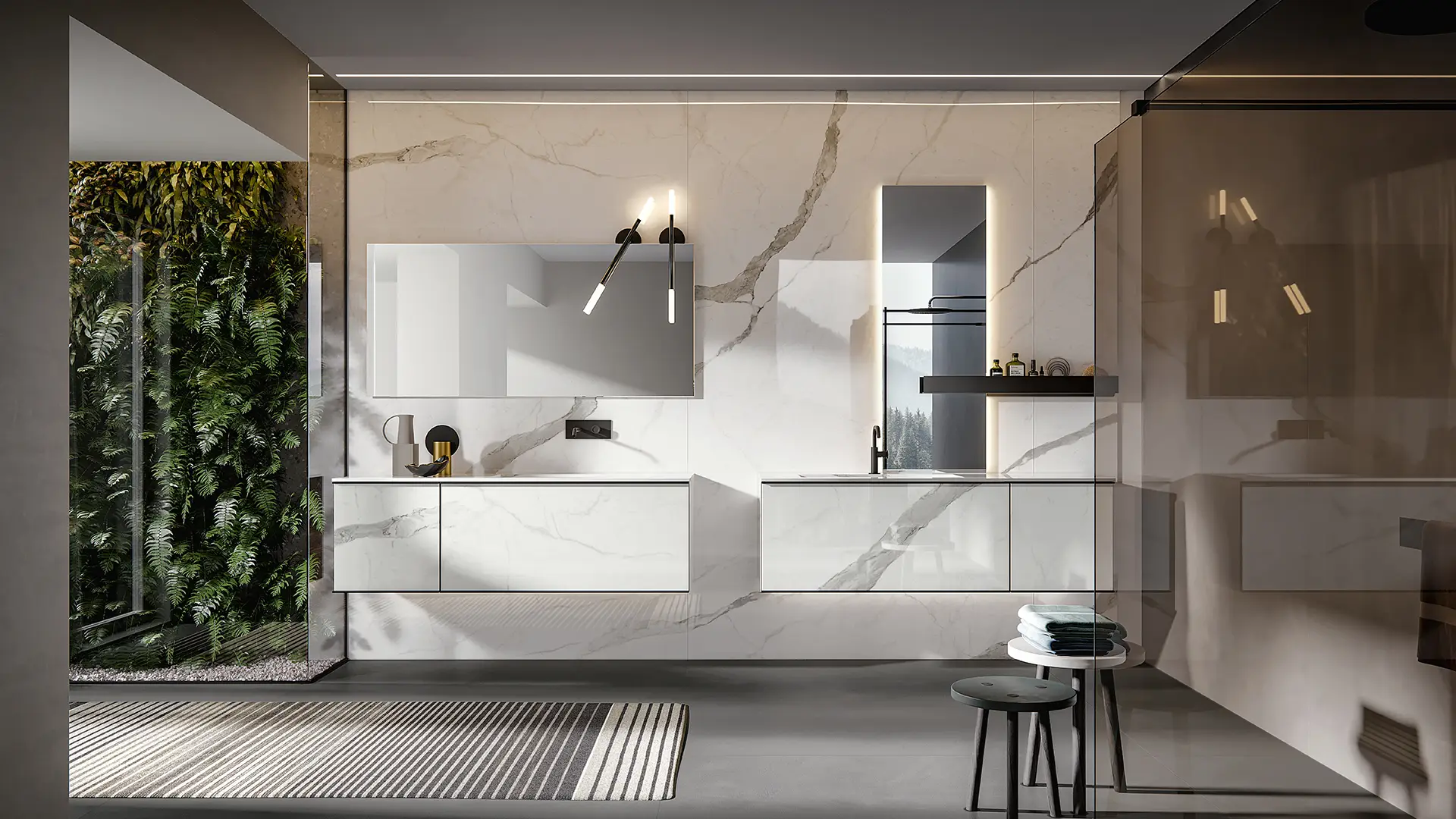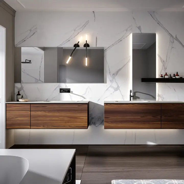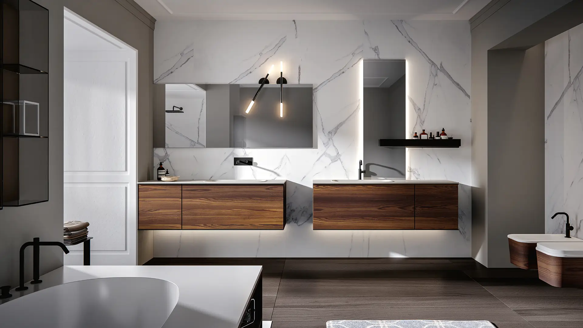 DOORS AND DRAWER FRONTS: made of panels in MDF, Glass, Fume Mirror, Veneer, Warm by Kerakoll and Laminam inserted into an aluminium frame. The aluminium frame is available in 5 finishes (Panna, Asfalto, Gold, Rosato and Champagne).